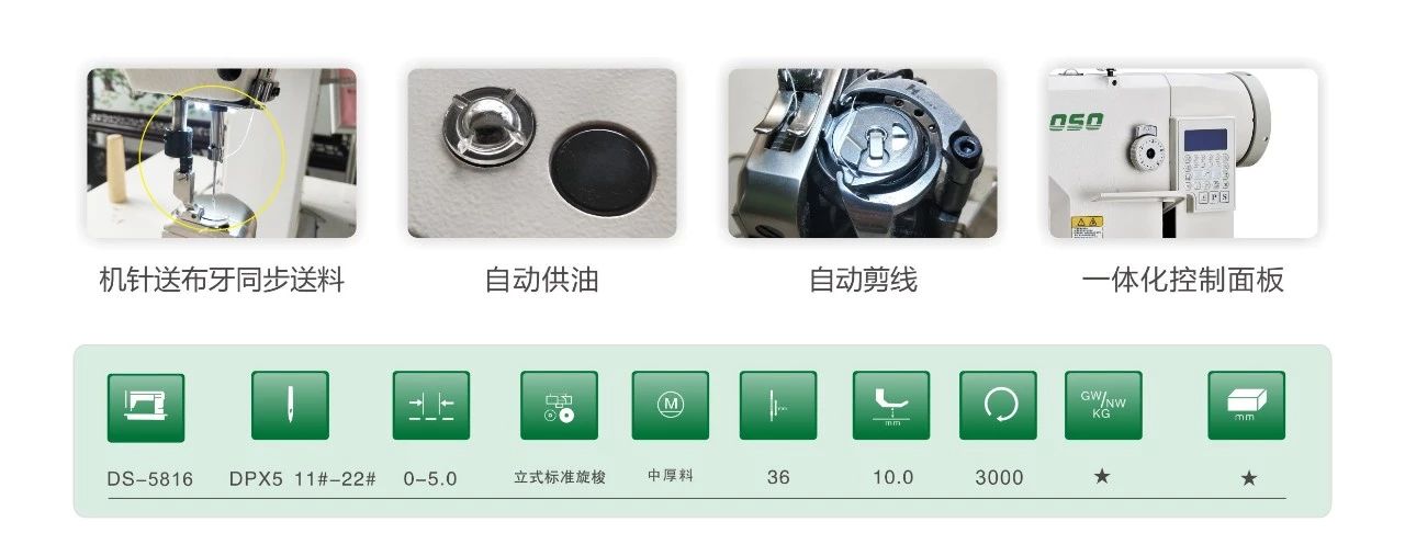 DS-5816 電腦針?biāo)透哳^車,是公司全新推出的一款高臺(tái)縫紉機(jī)。采用新式殼體設(shè)計(jì),線條流暢,造型美觀大方。新設(shè)計(jì)增加了整機(jī)穩(wěn)固性,減少了運(yùn)轉(zhuǎn)震動(dòng)對(duì)縫紉的影響,操作更舒適、縫制更穩(wěn)定、線跡更美觀。延長(zhǎng)使用壽命。本機(jī)運(yùn)轉(zhuǎn)速度3000r/min。